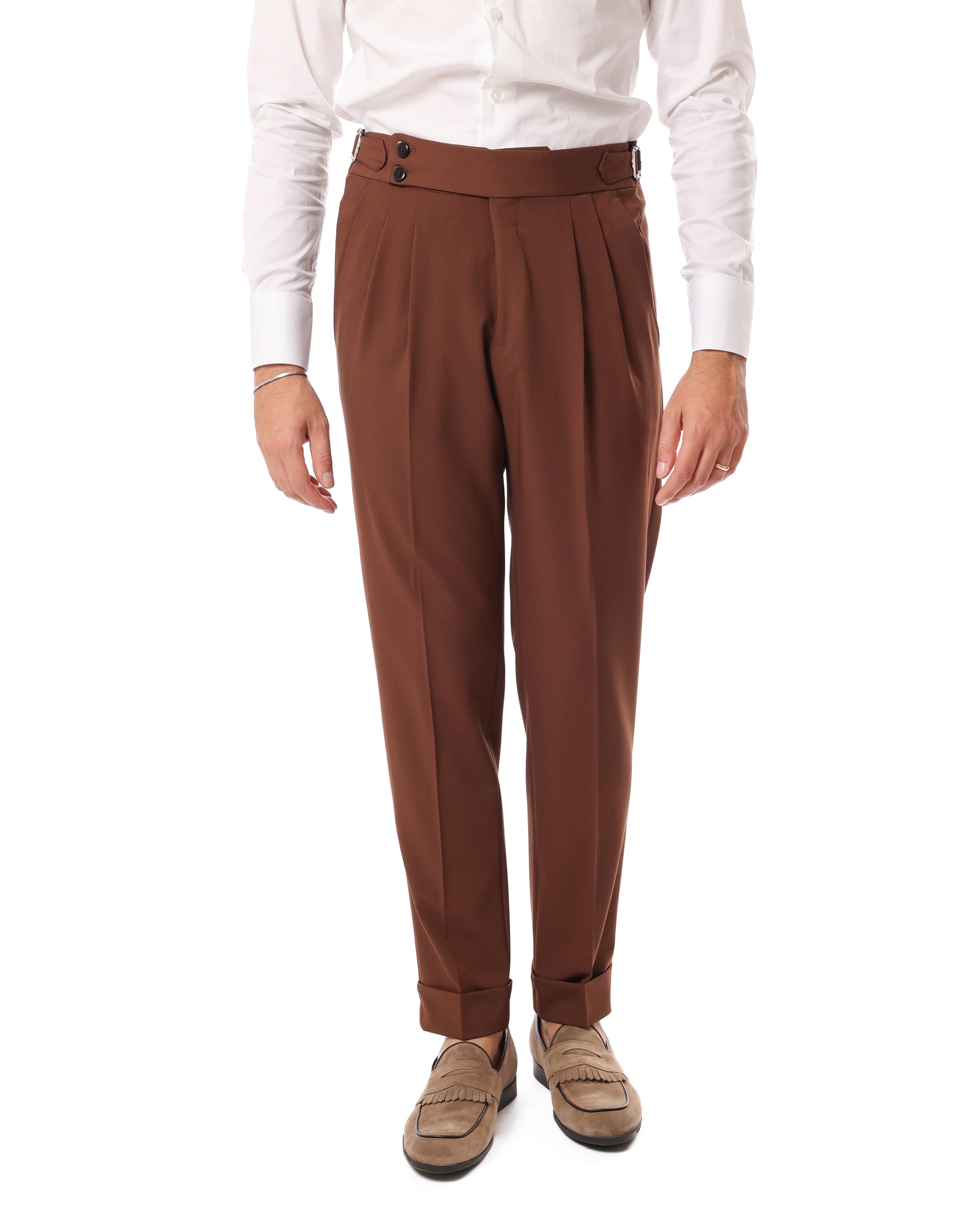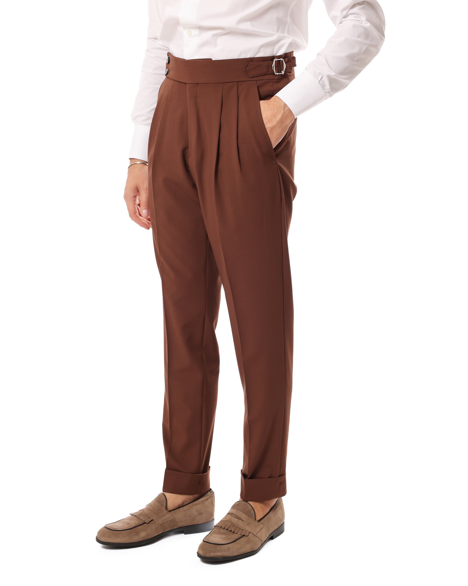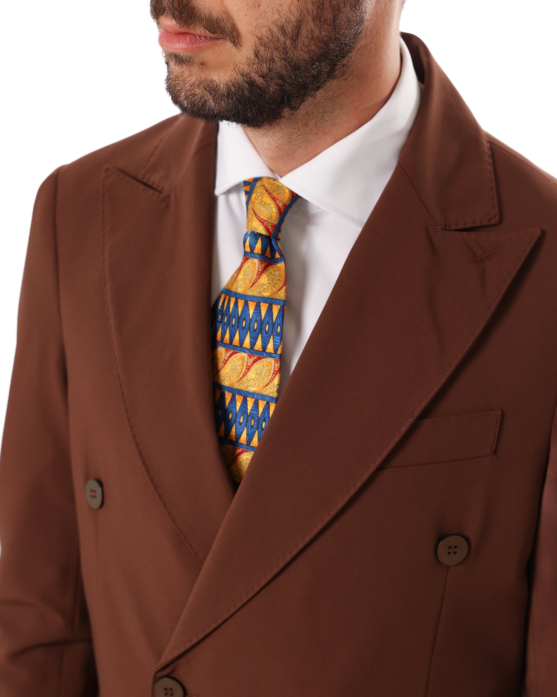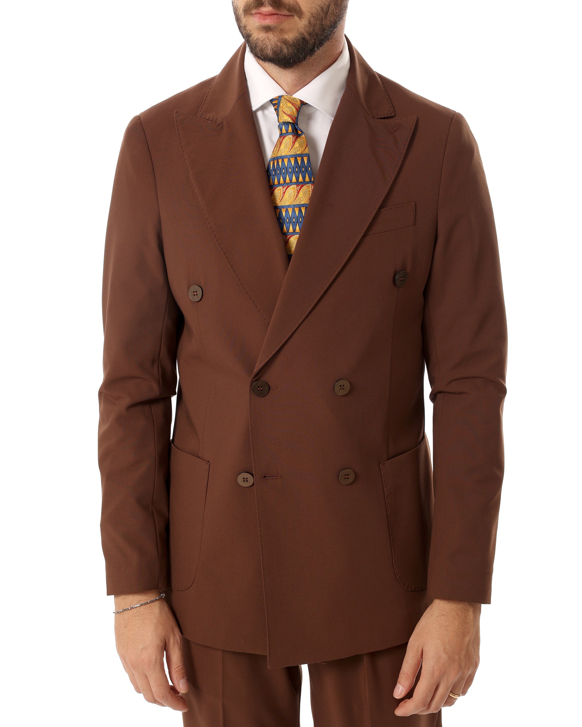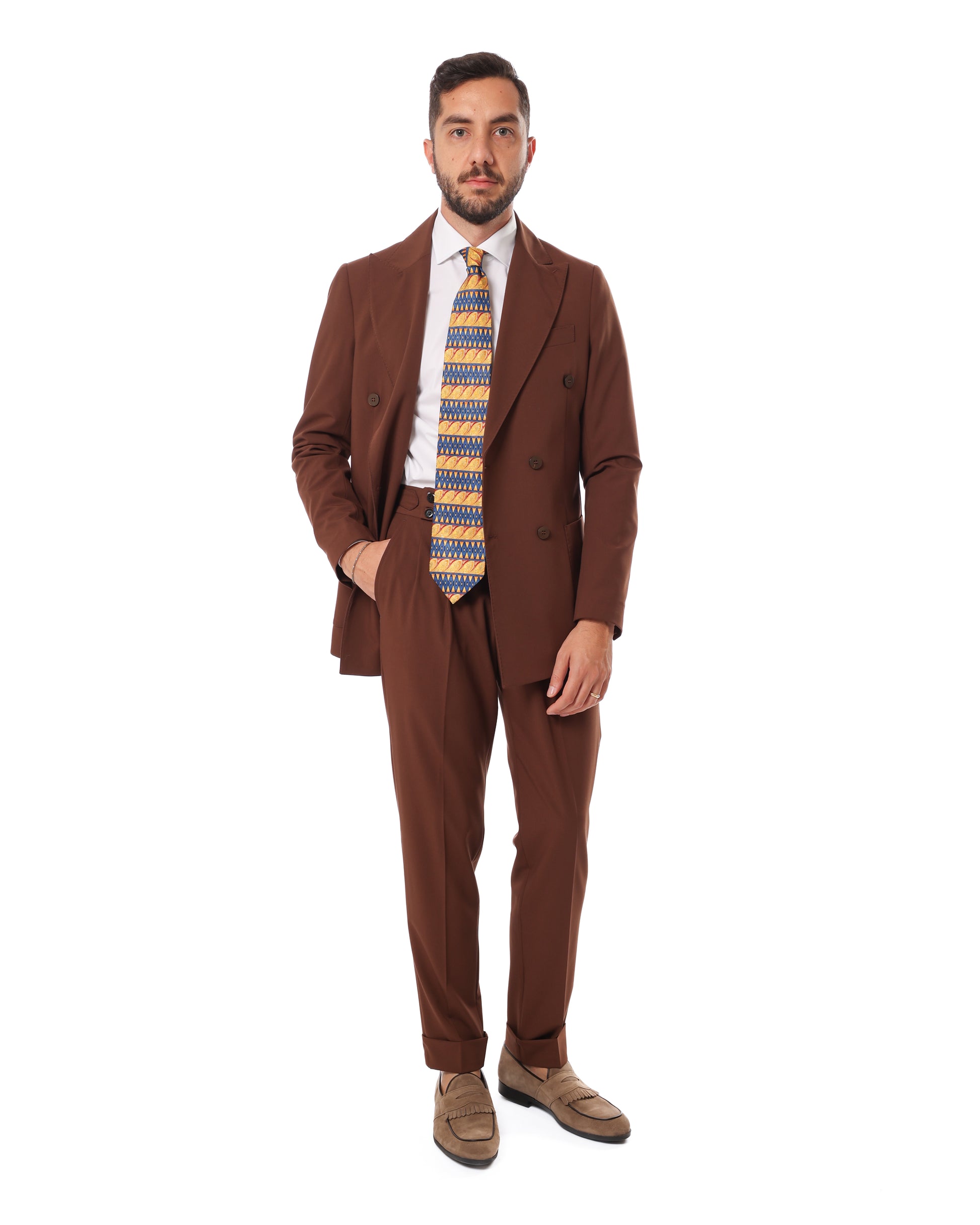 Abito doppio petto 4 bottoni con revers a lancia da 10cm impunturato, il pantalone presenta un modello vita alta doppia pinces con regolatori ai lati e risvolto fisso al fondo.