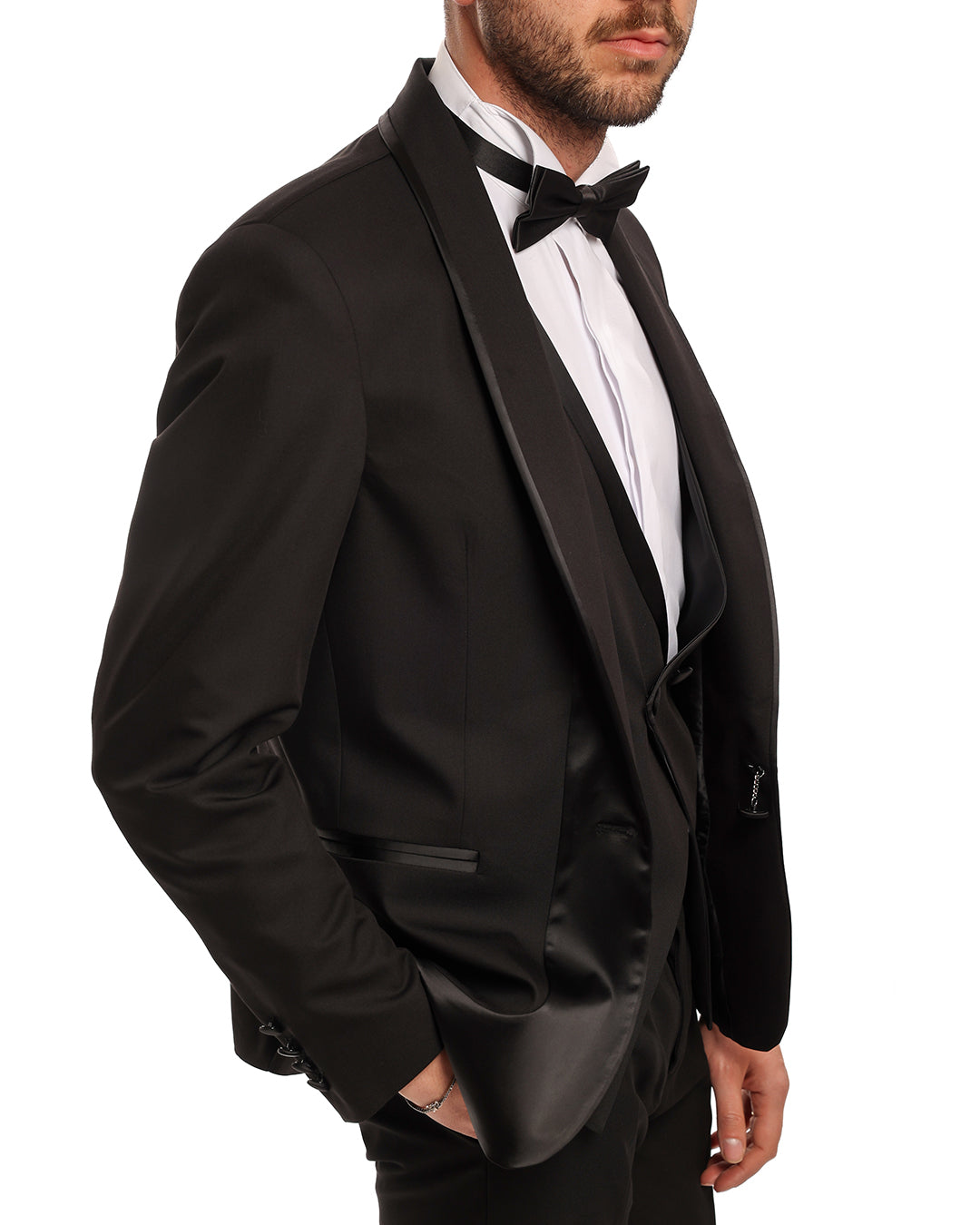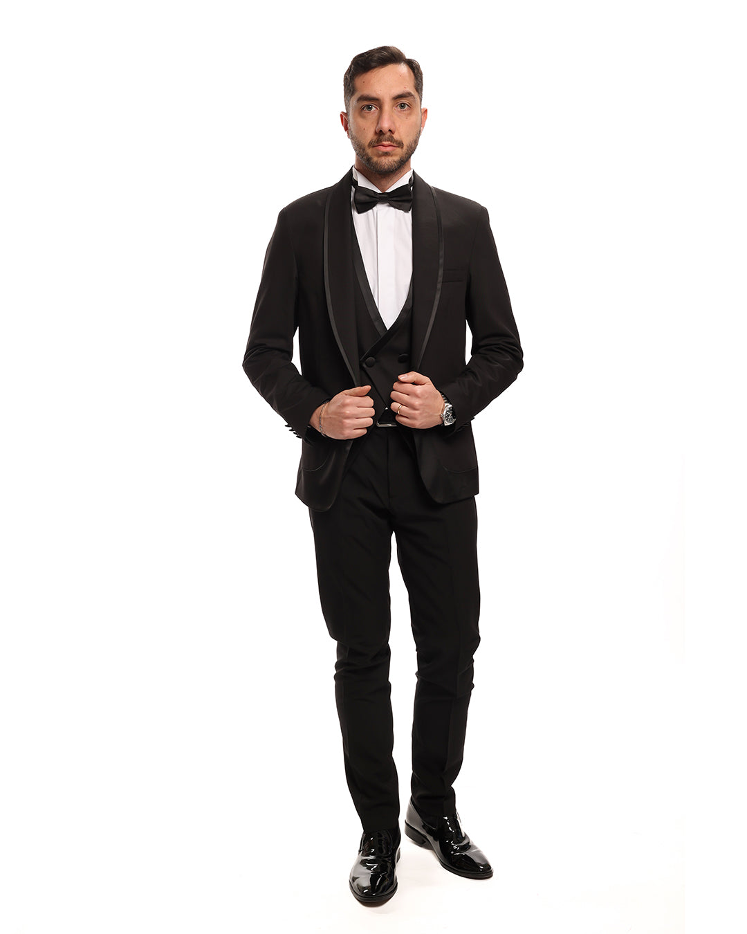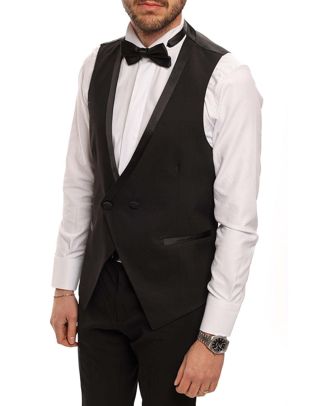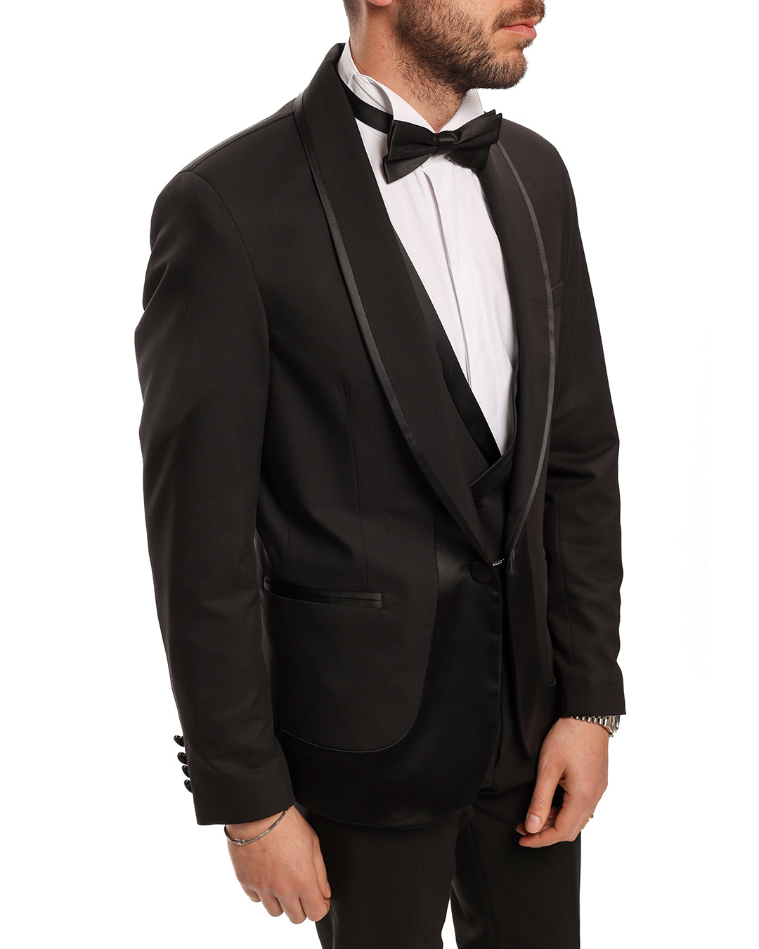 Abito smoking con revers a scialle e profilo in raso lucido. Presenta anche il gilet doppio petto due bottoni.