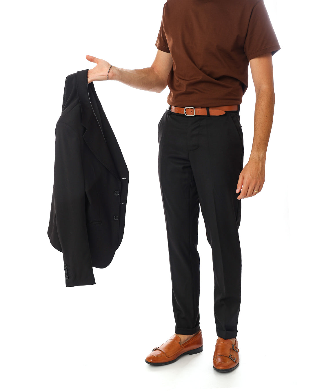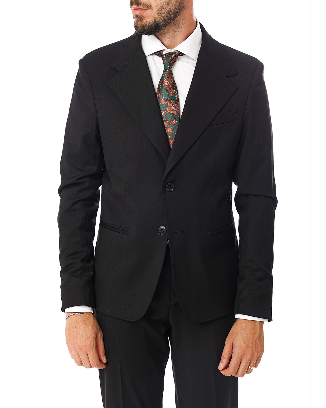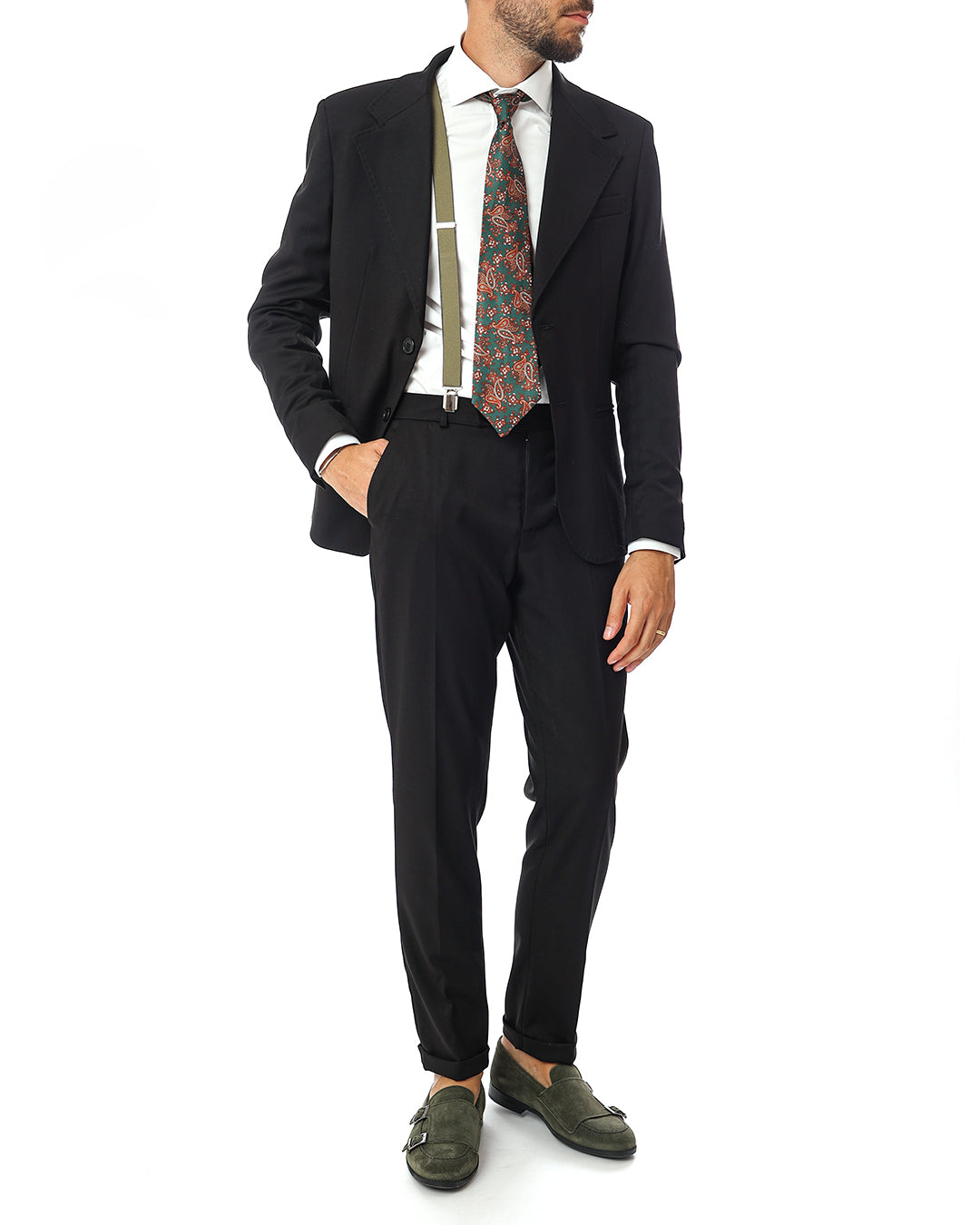 Abito monopetto con revers dentellato da 10cm slim fit. Il modello in foto indossa una 46 è alto 1.70m e pesa 65 kg