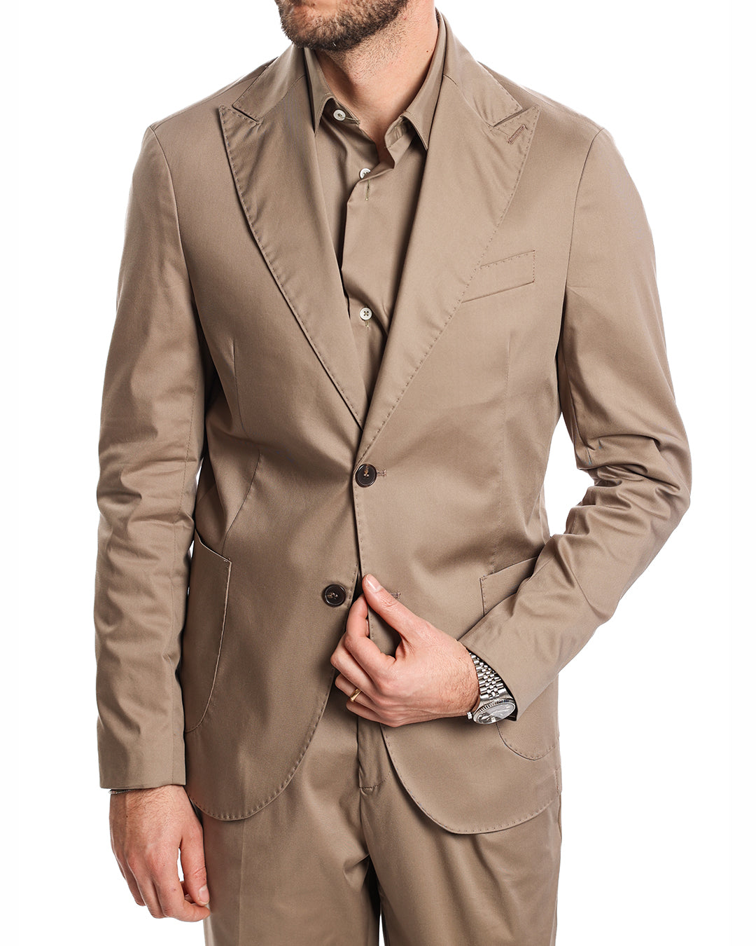 Abito monopetto a tre pezzi composto da giacca camicia e pantalone nello stesso tessuto e colore.