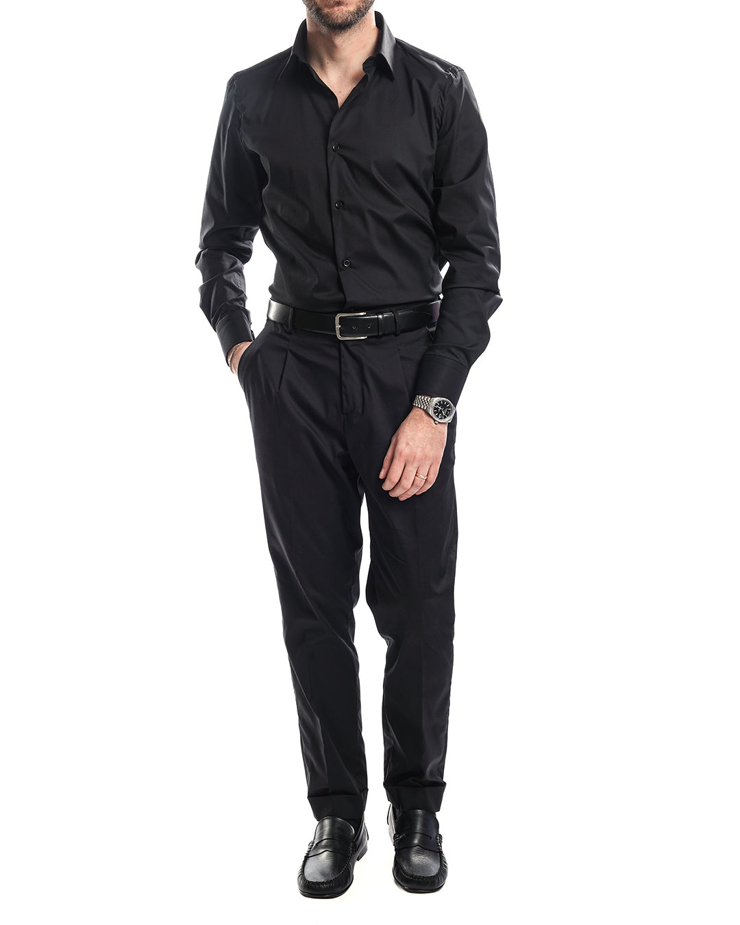 Abito monopetto a tre pezzi composto da giacca camicia e pantalone nello stesso tessuto e colore.