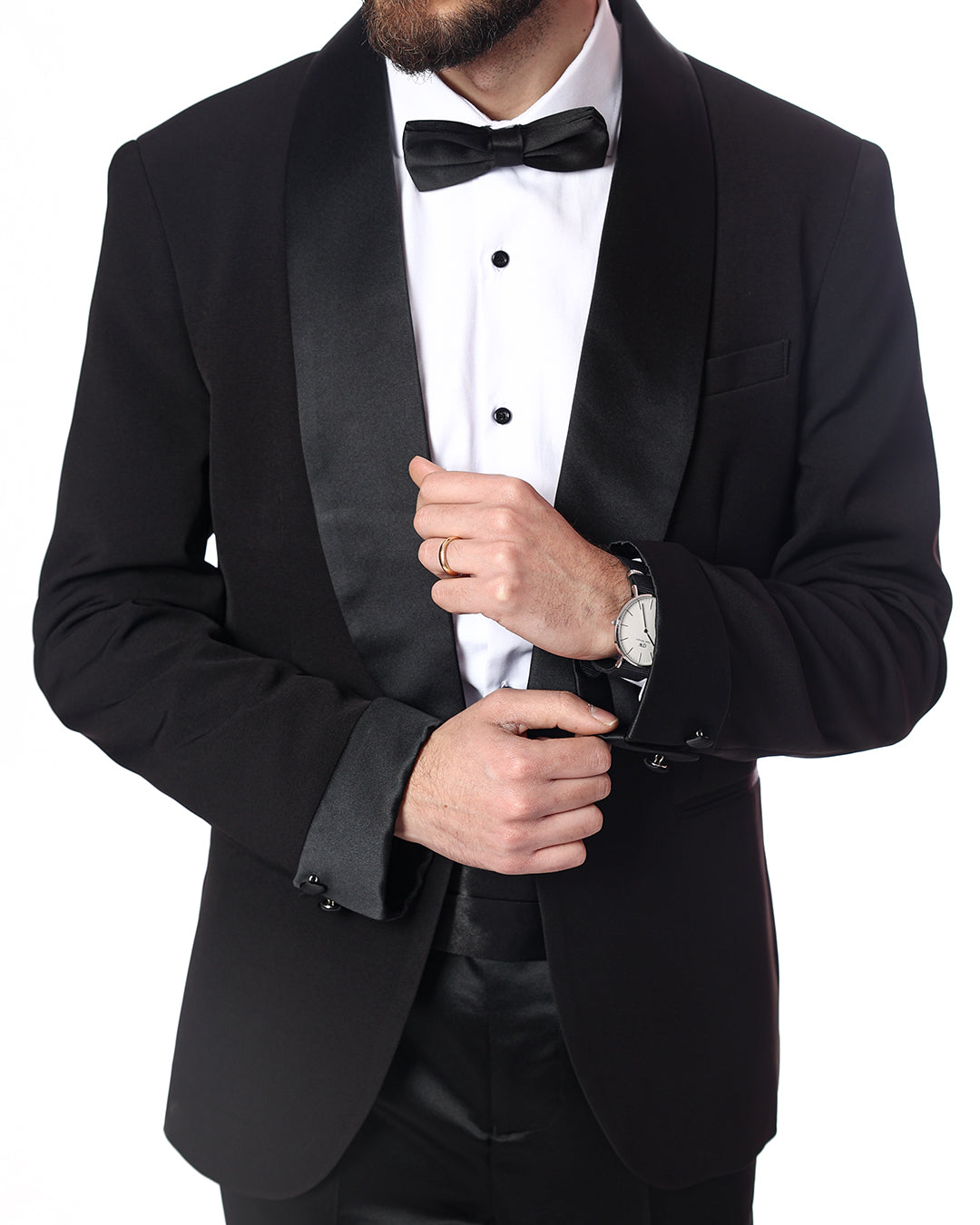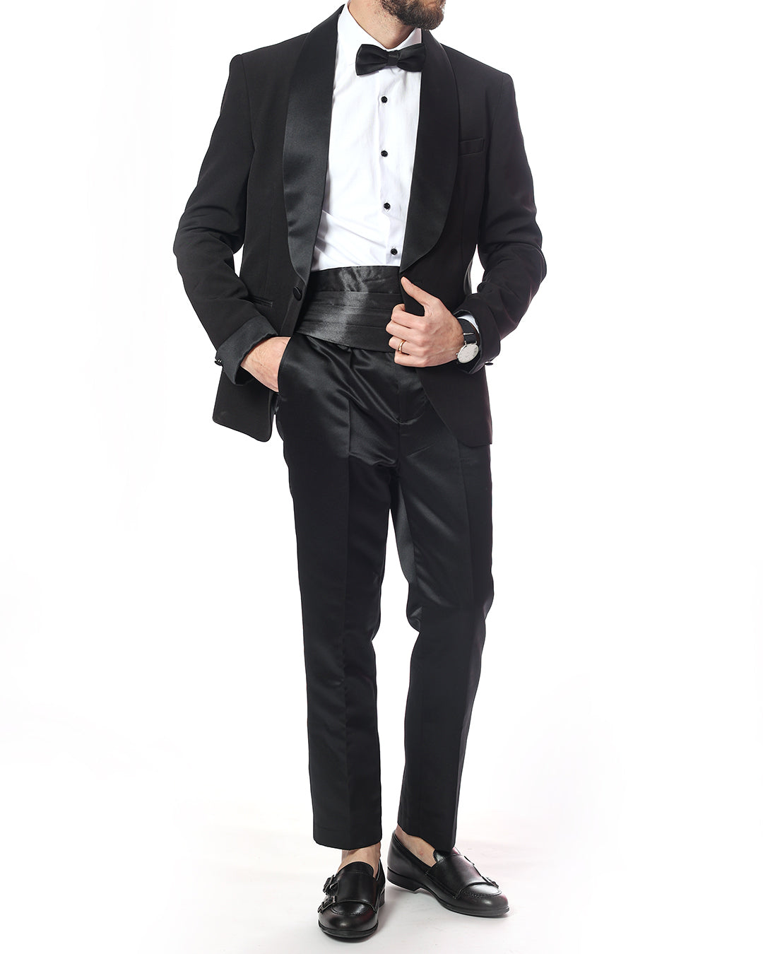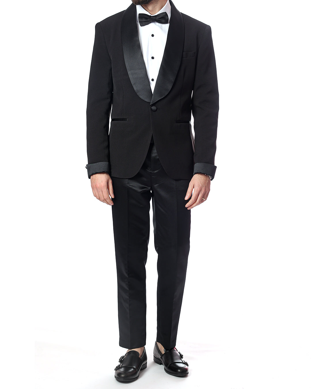 Abito smoking revers a scialle con maniche risvoltate in raso slim fit