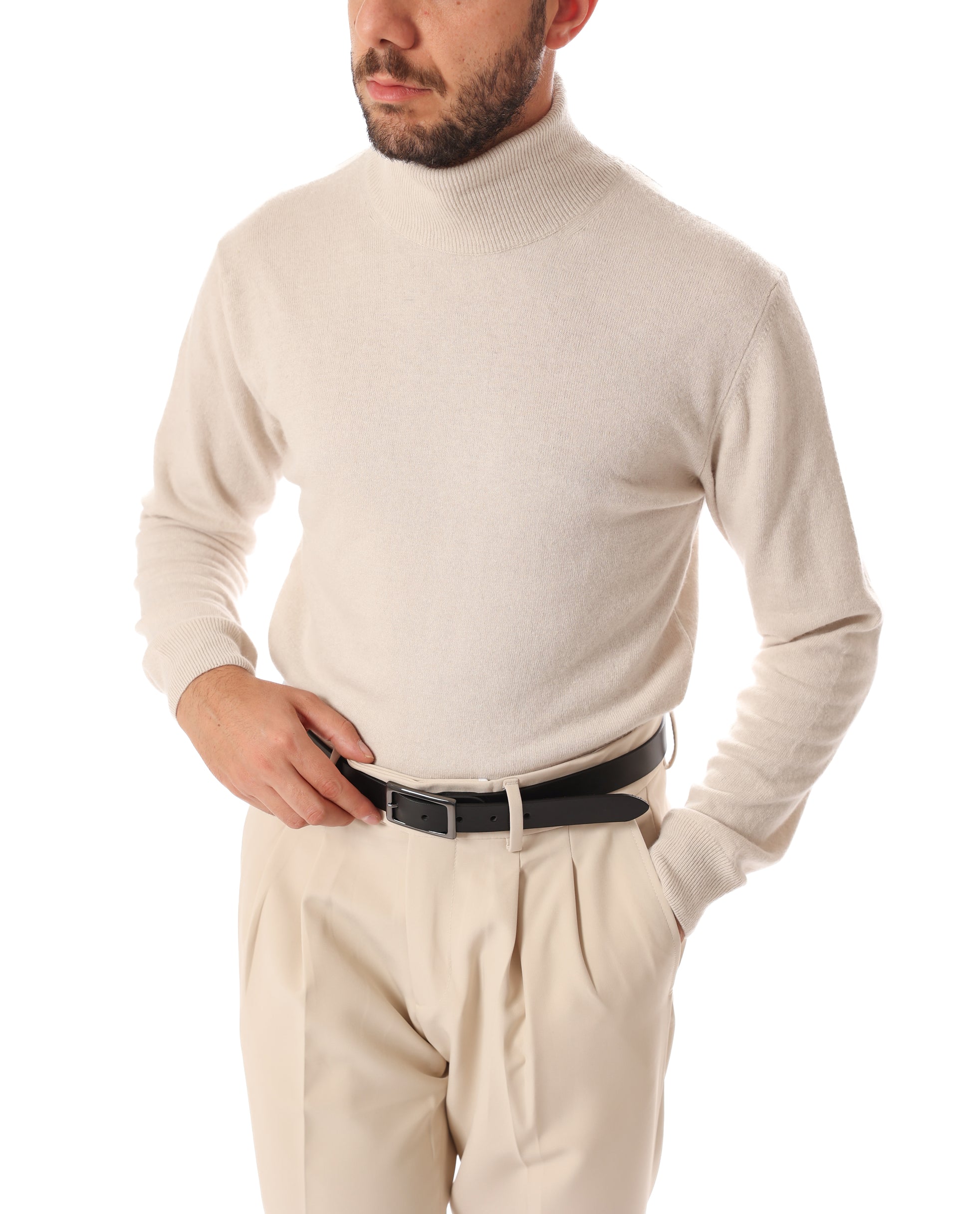 Dolcevita in misto cashmere . Il modello in foto è alto 1.73 pesa 65kg indossa una M.