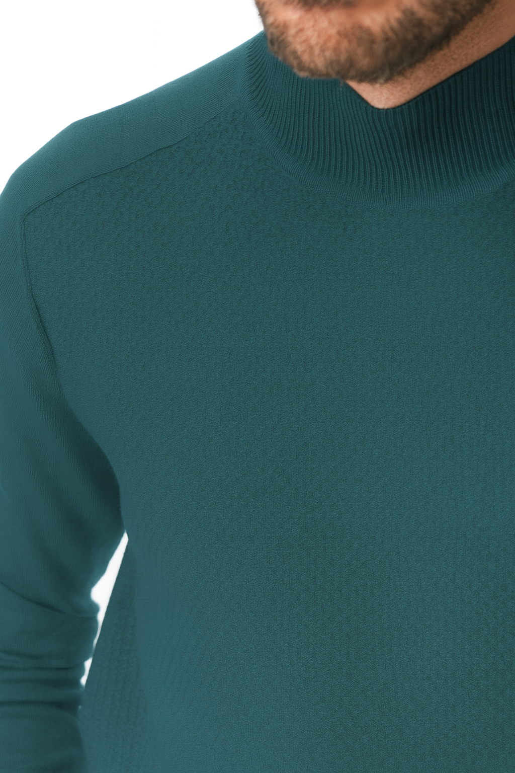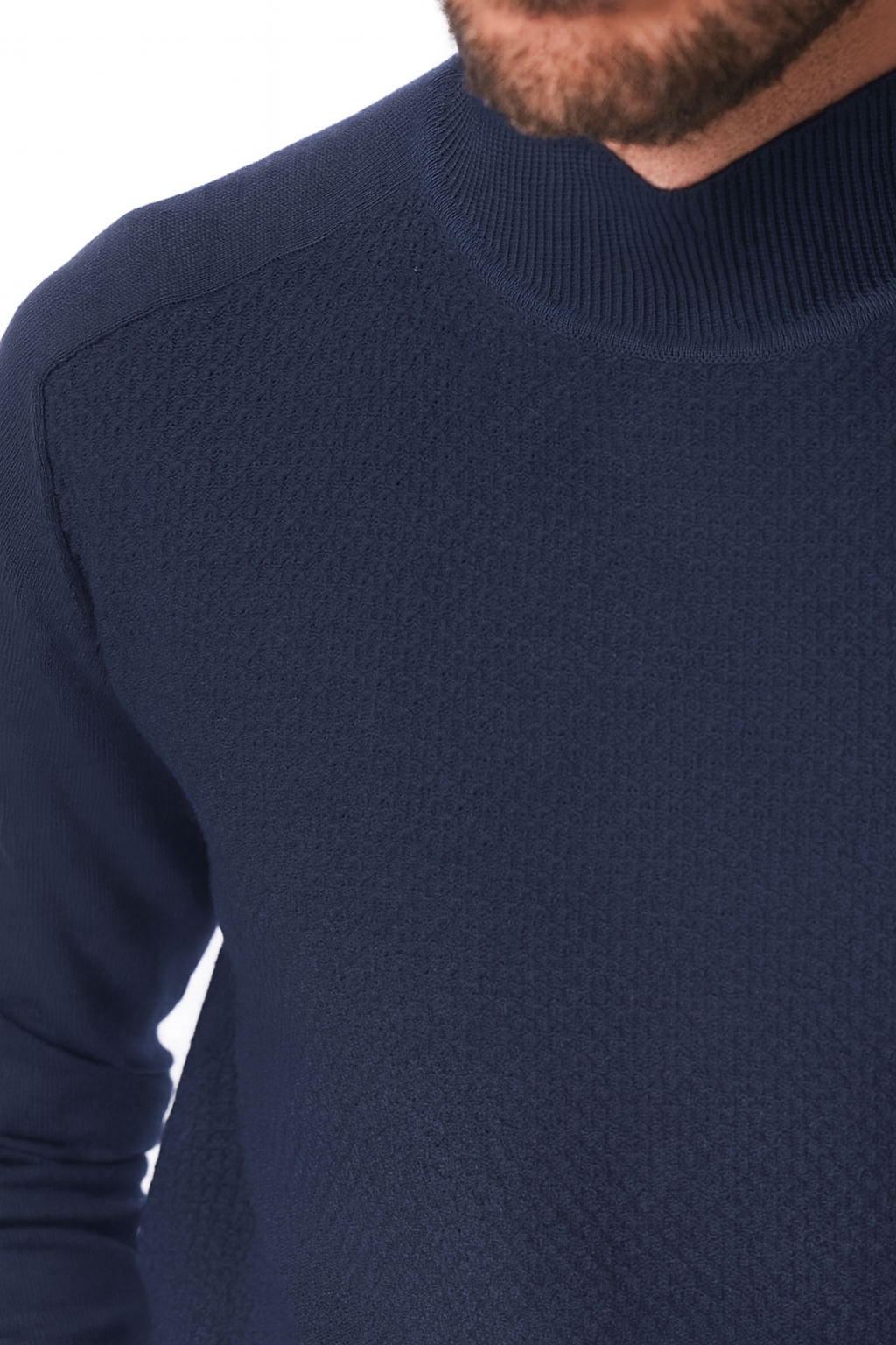 Lupetto con intarsio geometrico tono su tono in viscosa e cotone . Il modello in foto è alto 1.73 pesa 65kg indossa una S