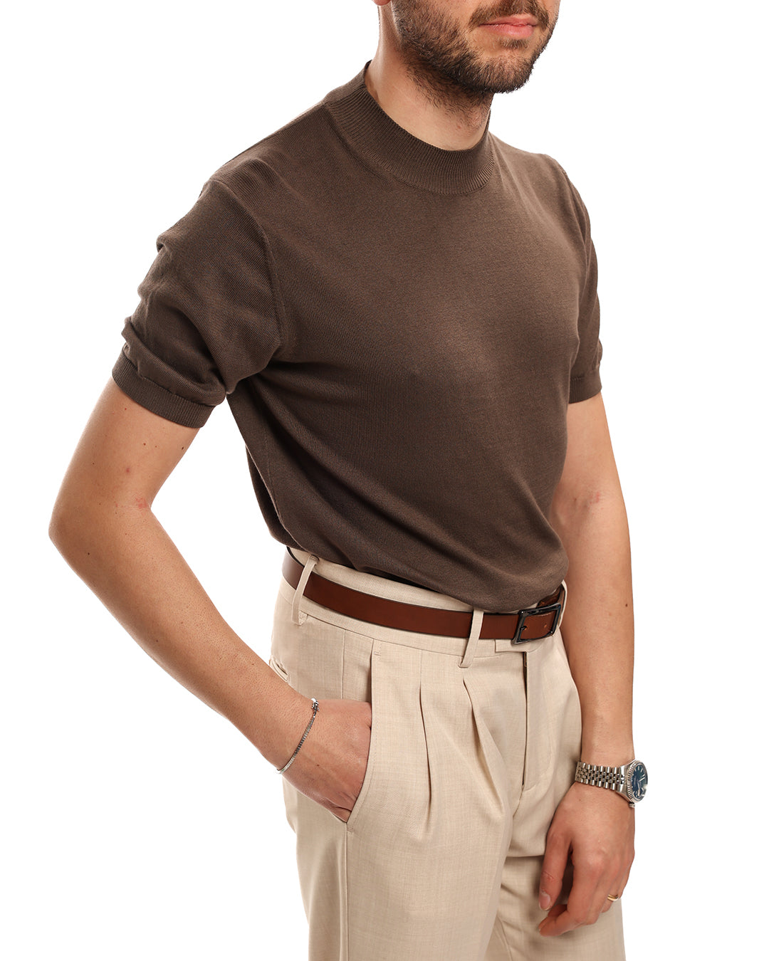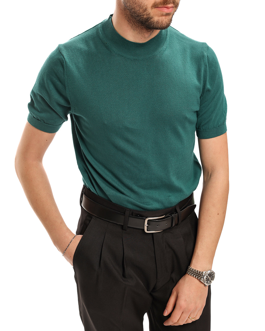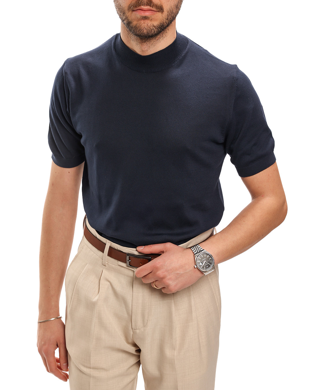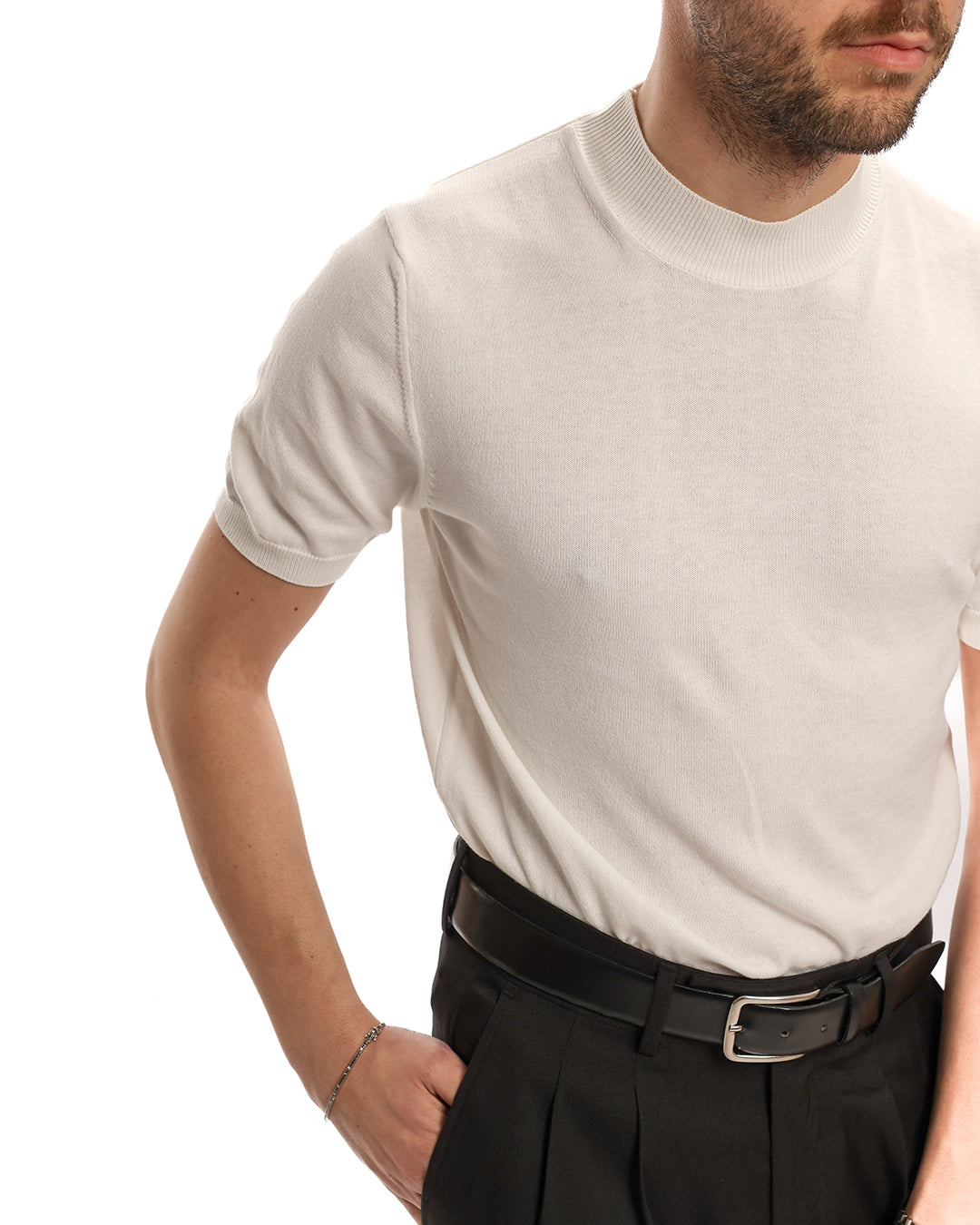 Lupetto mezza manica in filo. il modello in foto indossa una M è alto 1.70 e pesa 65kg