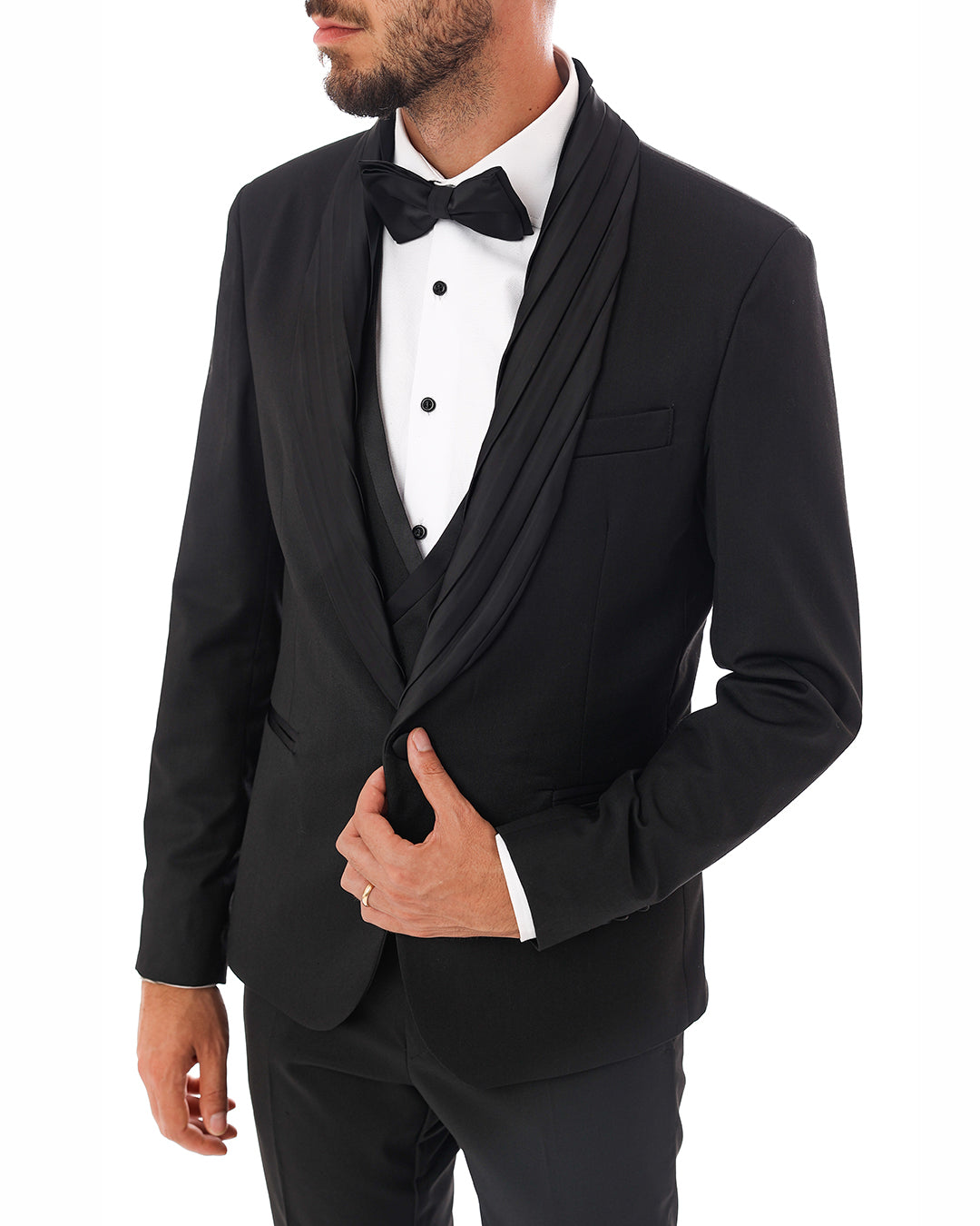 Abito smoking 3pz giacca gilet e pantalone con revers a scialle plissettato in raso nero.