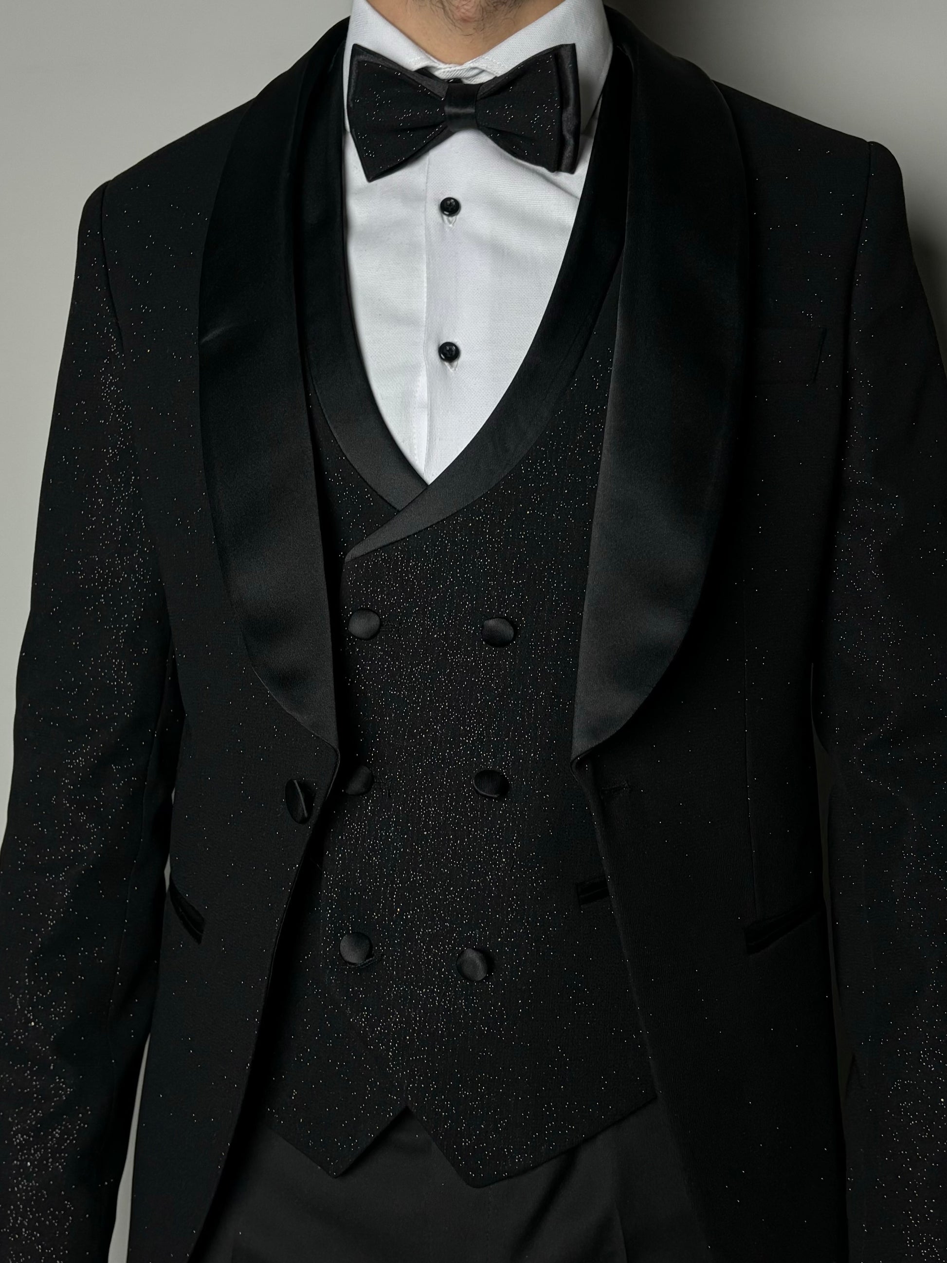 Abito smoking 3pz giacca gilet papillon e pantalone con revers a scialle in raso nero, giacca e gilet realizzati in tessuto glitter nero.