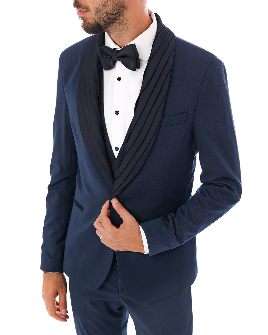 Abito smoking 3pz giacca gilet e pantalone con revers a scialle plissettato in raso blu.